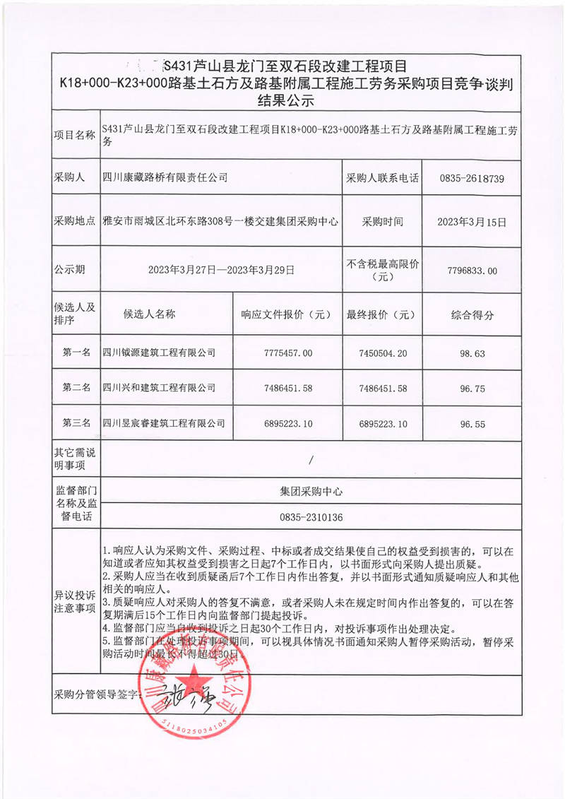 四川康藏路橋有限責(zé)任公司S431蘆山縣龍門至雙石段改建工程項(xiàng)目K18+000-K23+000路路基附屬工程施工勞務(wù)采購項(xiàng)目競爭談判結(jié)果公示