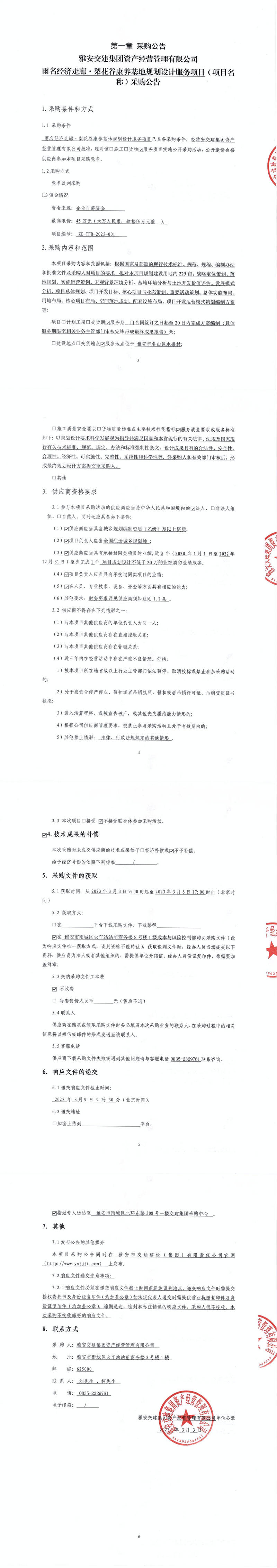 雅安交建集團(tuán)資產(chǎn)經(jīng)營管理有限公司雨名經(jīng)濟(jì)走廊·梨花谷康養(yǎng)基地規(guī)劃設(shè)計(jì)服務(wù)項(xiàng)目(項(xiàng)目名稱)采購公告