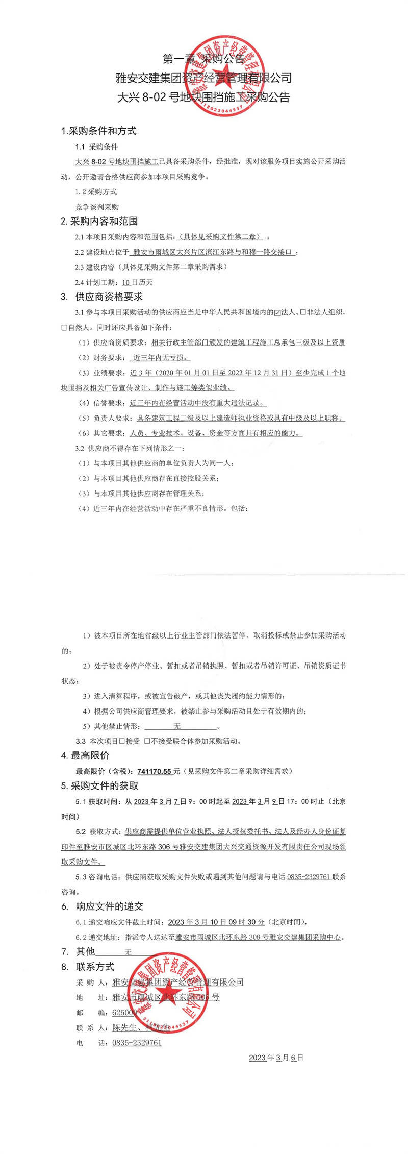 雅安交建集團資產經營管理有限公司大興8-02號地塊圍擋施工采購公告