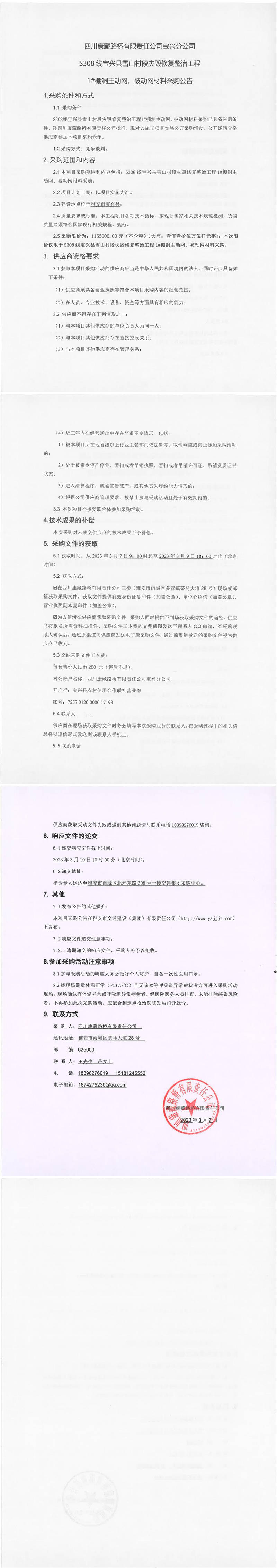 四川康藏路橋有限責任公司寶興分公司S308線寶興縣雪山村段災毀修復整治工程1#棚洞主動網、被動網材料采購公告