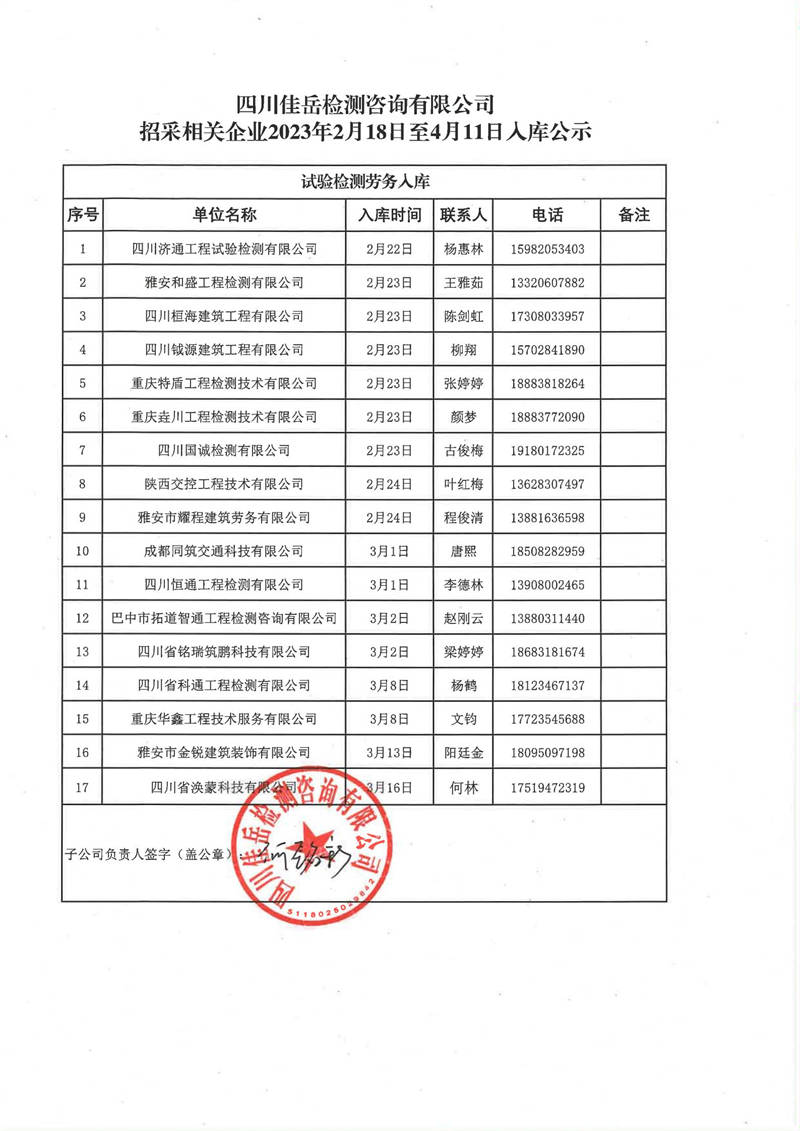 四川佳岳檢測(cè)咨詢(xún)有限公司(試驗(yàn)檢測(cè)勞務(wù)供應(yīng)商庫(kù))2023年2月18日至4月11日入庫(kù)結(jié)果公示