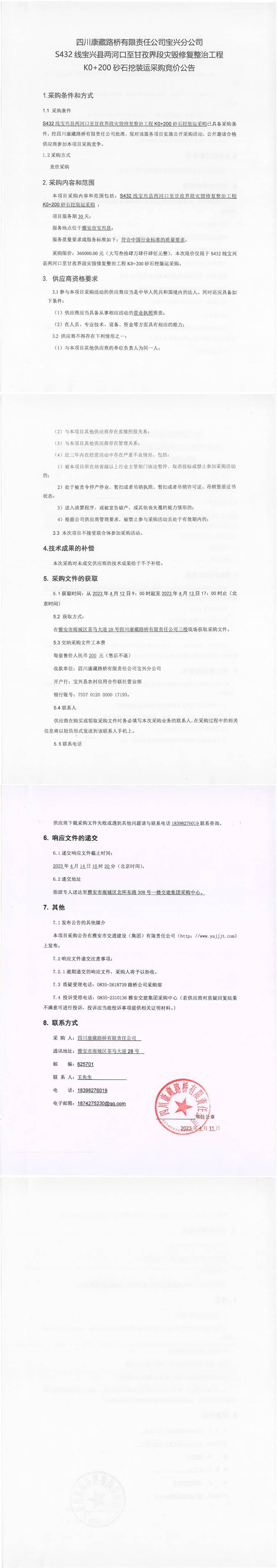 四川康藏路橋有限責(zé)任公司寶興分公司S432寶興縣兩河口至甘孜界段災(zāi)毀修復(fù)整治工程K0+200砂石挖裝運采購競價公告