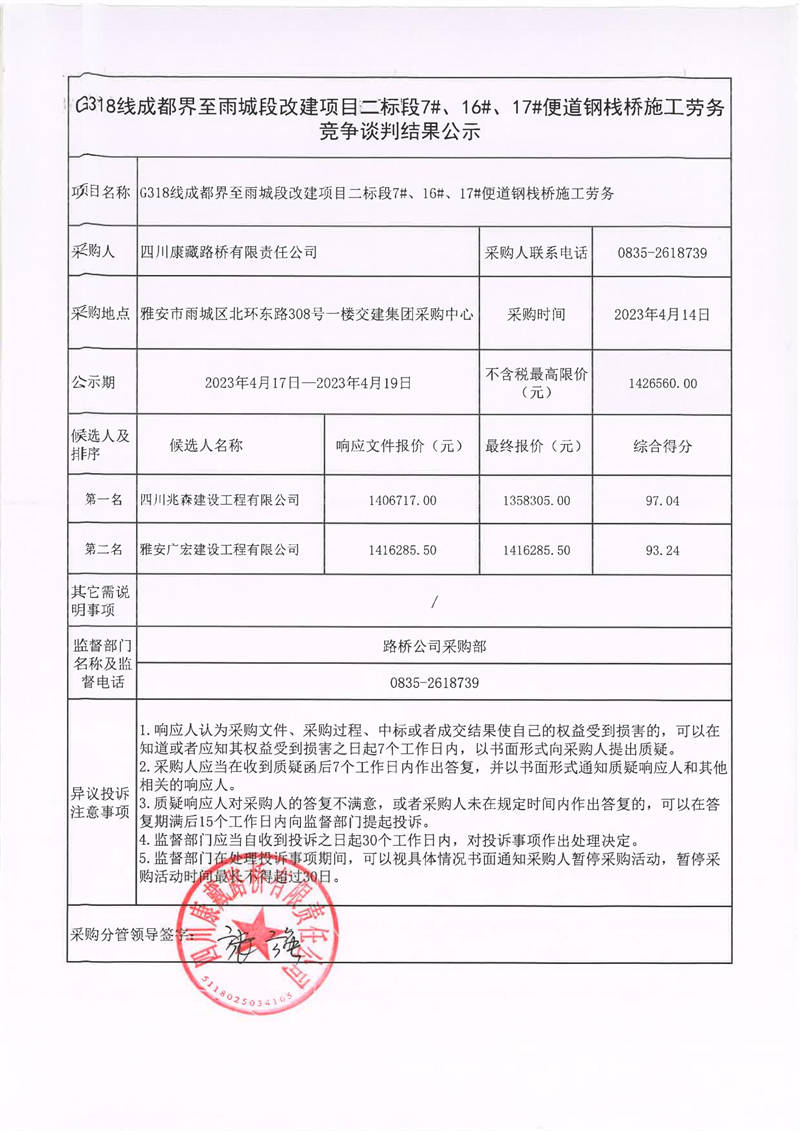四川康藏路橋有限責任公司G318線成都至雨城段改建項目二標段7#、16#、17#便道鋼棧橋施工勞務競爭談判結果公示