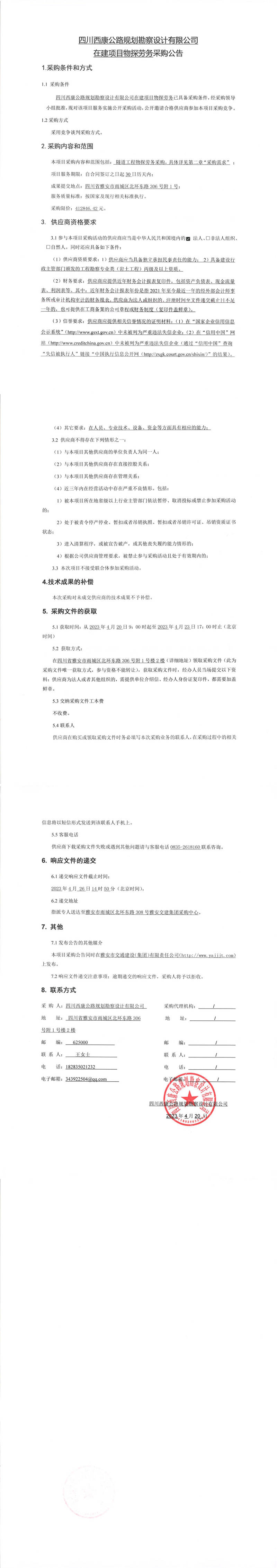 四川西康公路規(guī)劃勘察設(shè)計有限公司在建項目物探勞務(wù)采購公告