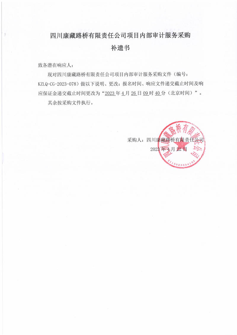 四川康藏路橋有限責(zé)任公司項目內(nèi)部審計服務(wù)采購補(bǔ)遺書