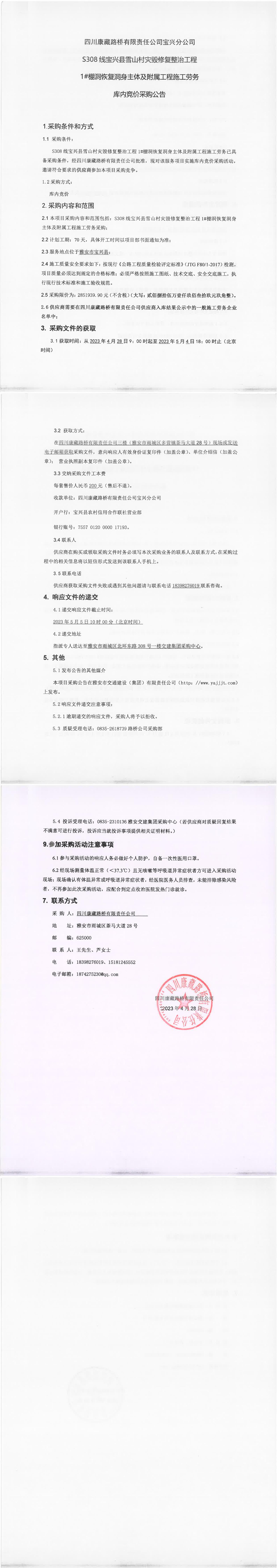 四川康藏路橋有限責任公司寶興分公司S308線寶興縣雪山村段災毀修復整治工程1#棚洞恢復洞身主體及附屬工程施工勞務庫內競價采購公告
