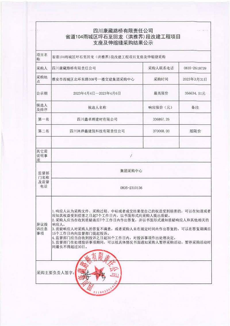 四川康藏路橋有限責任公司省道104雨城區(qū)坪石至回龍(洪雅界)段改建工程項目支座及伸縮縫采購結果公示