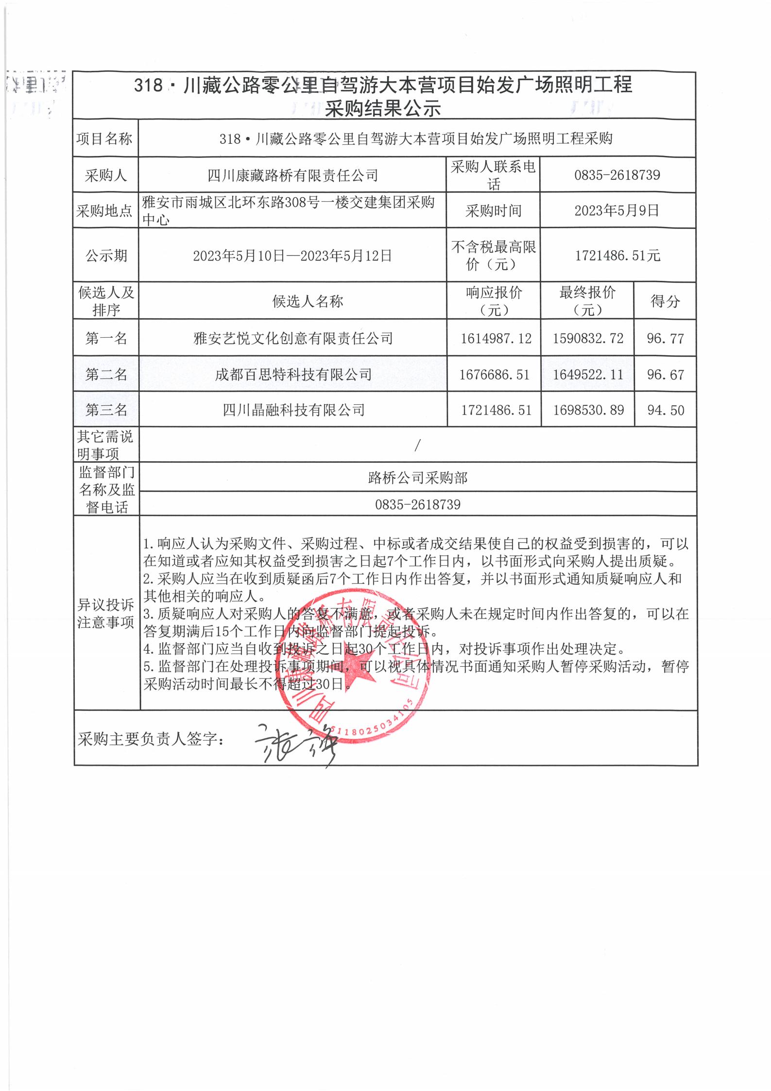 四川康藏路橋有限責(zé)任公司318·川藏公路零公里自駕游大本營項目始發(fā)廣場照明工程采購結(jié)果公示