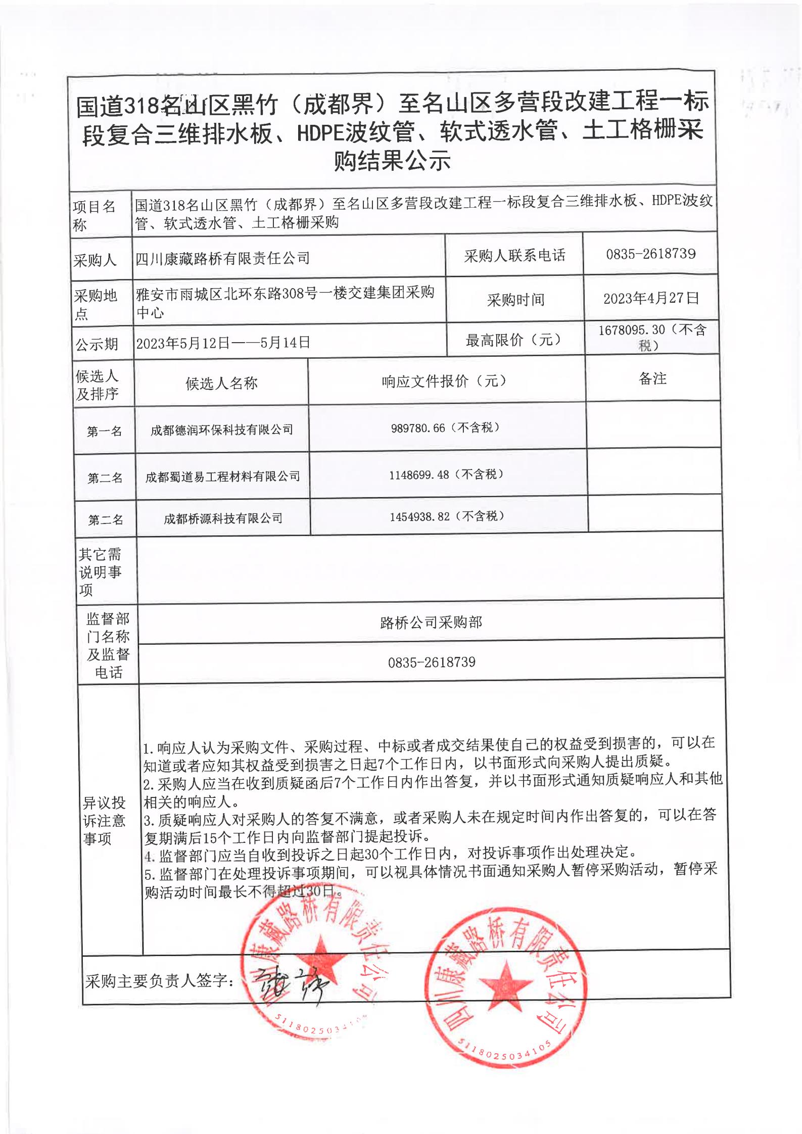 四川康藏路橋有限責(zé)任公司國道318名山區(qū)黑竹(成都界)至雨城區(qū)多營段改建工程一標段復(fù)合三維排水板、HDPE波紋管、軟式透水管、土工格柵采購結(jié)果公示