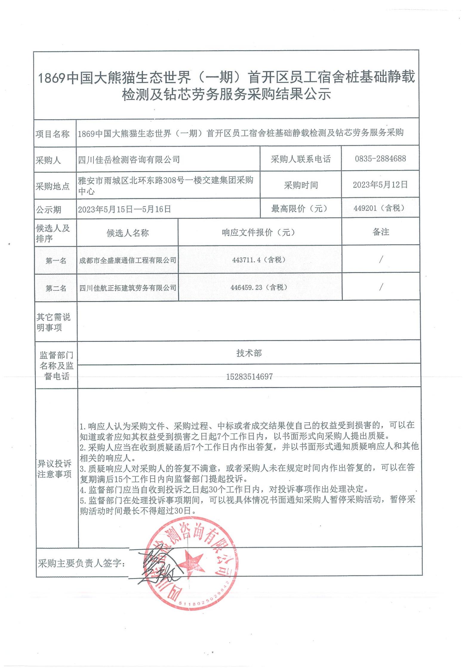 四川佳岳檢測(cè)咨詢有限公司關(guān)于1869中國(guó)大熊貓生態(tài)世界(一期)首開(kāi)區(qū)員工宿舍樁基礎(chǔ)靜載檢測(cè)勞務(wù)及鉆芯項(xiàng)目中標(biāo)結(jié)果公示