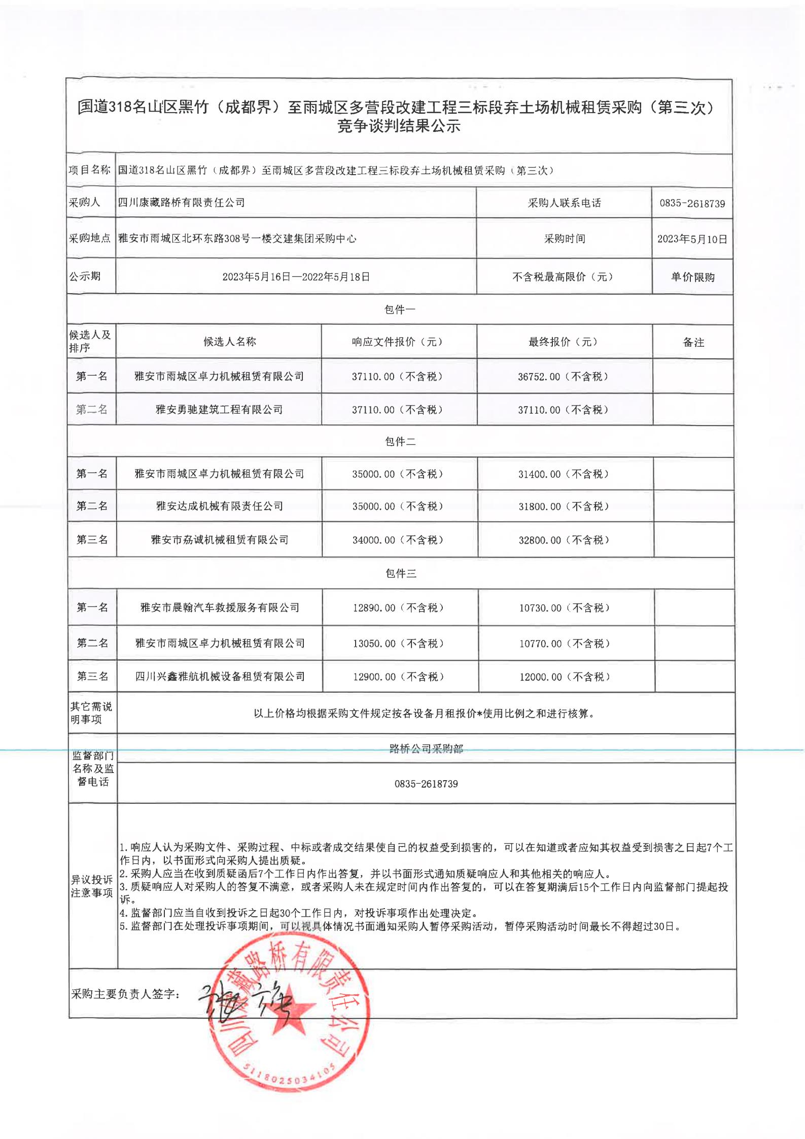 四川康藏路橋有限責(zé)任公司國(guó)道318名山區(qū)黑竹(成都界)至雨城區(qū)多營(yíng)段改建工程三標(biāo)段棄土場(chǎng)機(jī)械租賃采購(gòu)(第三次)競(jìng)爭(zhēng)談判結(jié)果公示