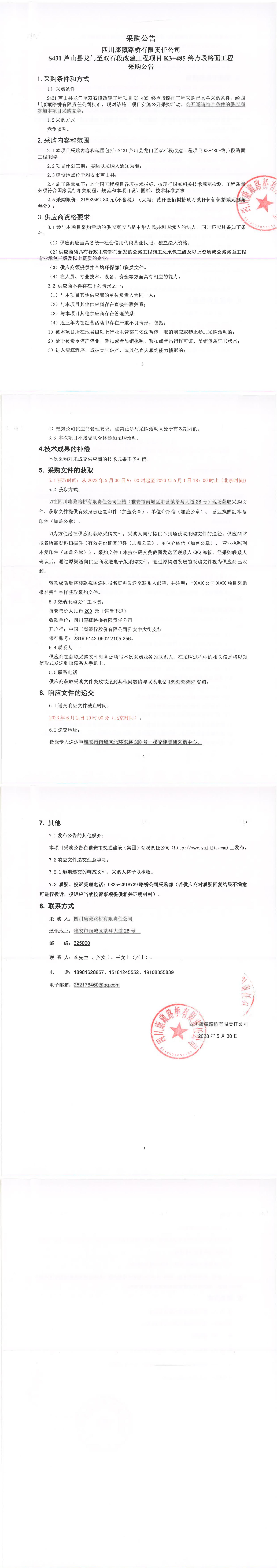 四川康藏路橋有限責(zé)任公司S431蘆山縣龍門至雙石段改建工程項目K3+485-終點(diǎn)段路面工程采購公告