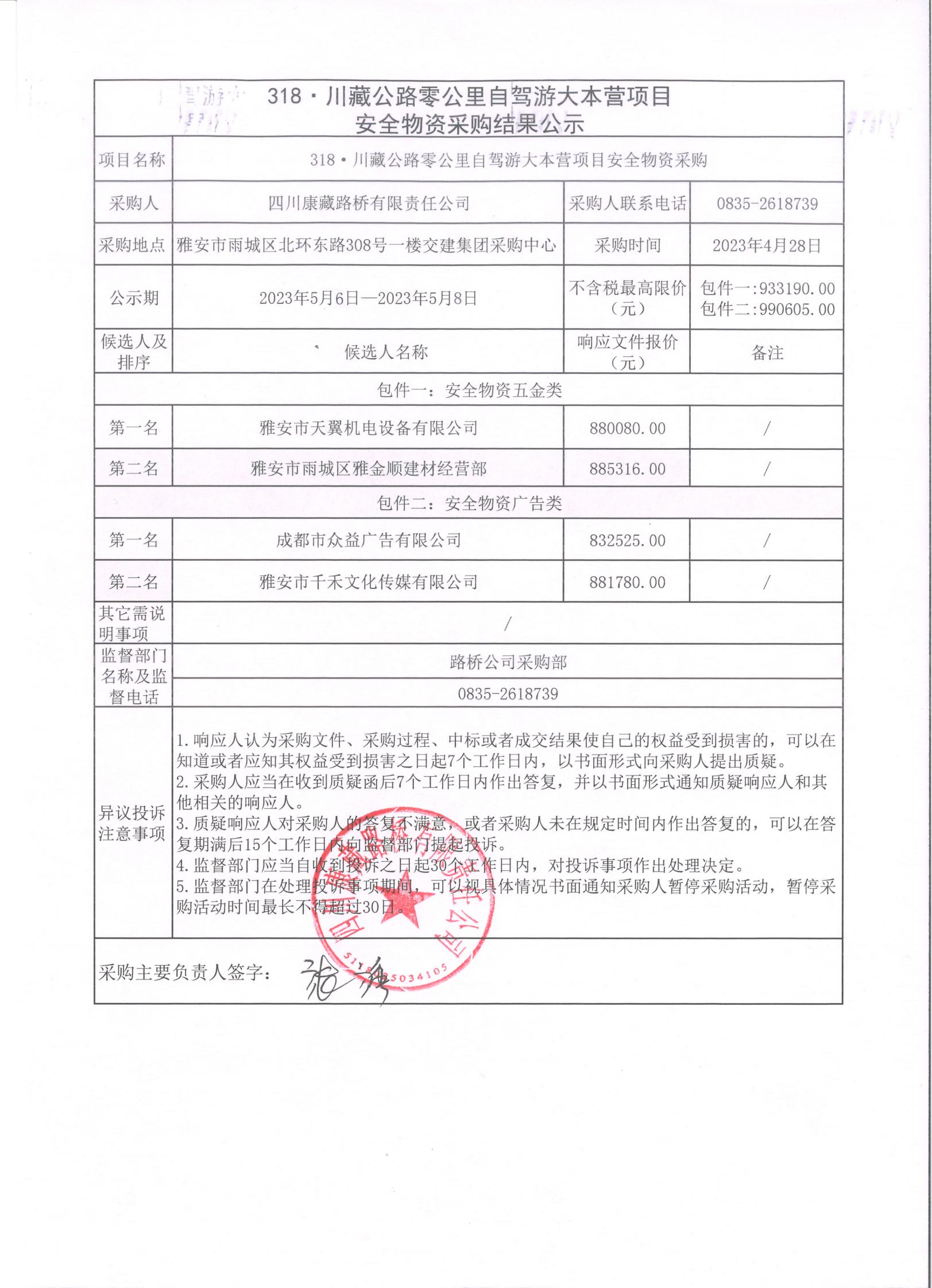 四川康藏路橋有限責任公司318·川藏公路零公里自駕游大本營項目安全物資采購結(jié)果公示