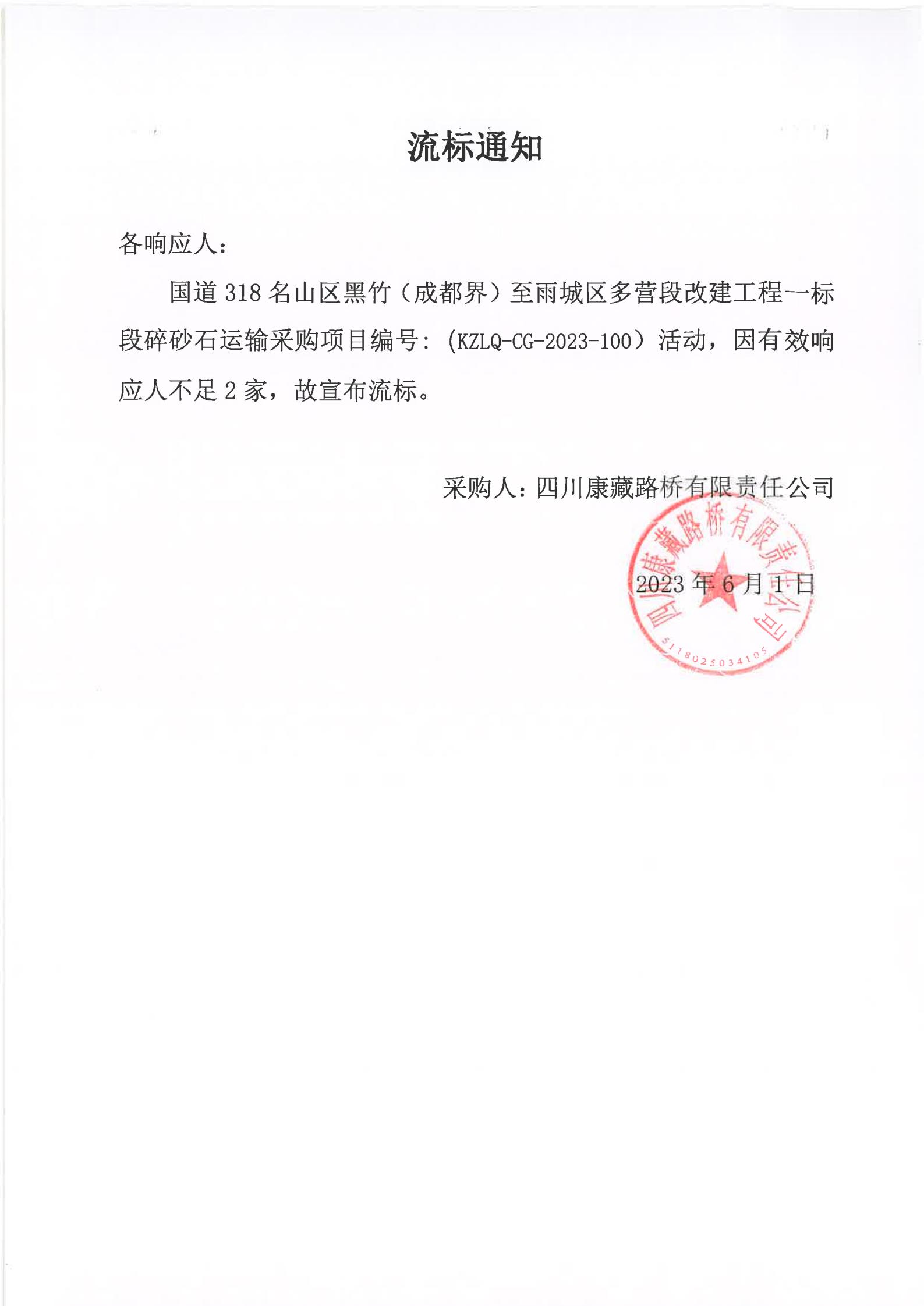 四川康藏路橋有限責(zé)任公司國道318名山區(qū)黑竹(成都界)至雨城區(qū)多營(yíng)段改建工程一標(biāo)段碎砂石運(yùn)輸采購流標(biāo)通知
