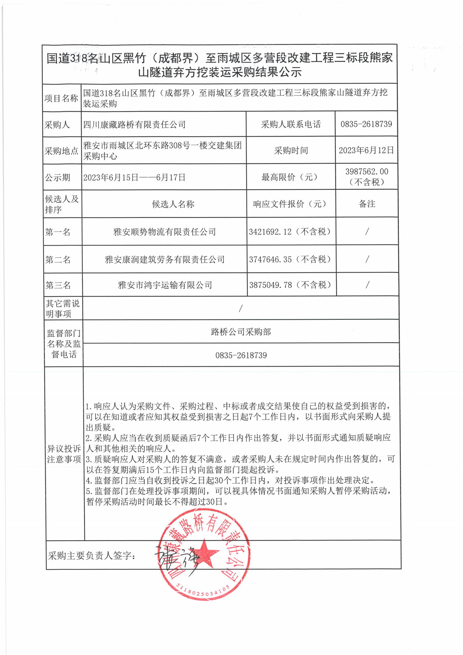 四川康藏路橋有限責(zé)任公司國道318名山區(qū)黑竹(成都界)至雨城區(qū)多營段改建工程三標(biāo)段熊家山隧道棄方挖裝運采購結(jié)果公示