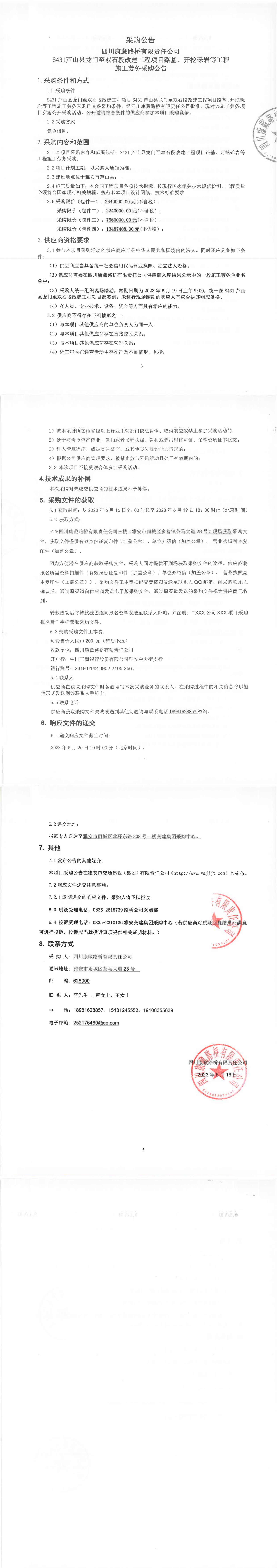 四川康藏路橋有限責(zé)任公司S431蘆山縣龍門至雙石段改建工程項目路基、開挖礫巖等工程施工勞務(wù)采購公告