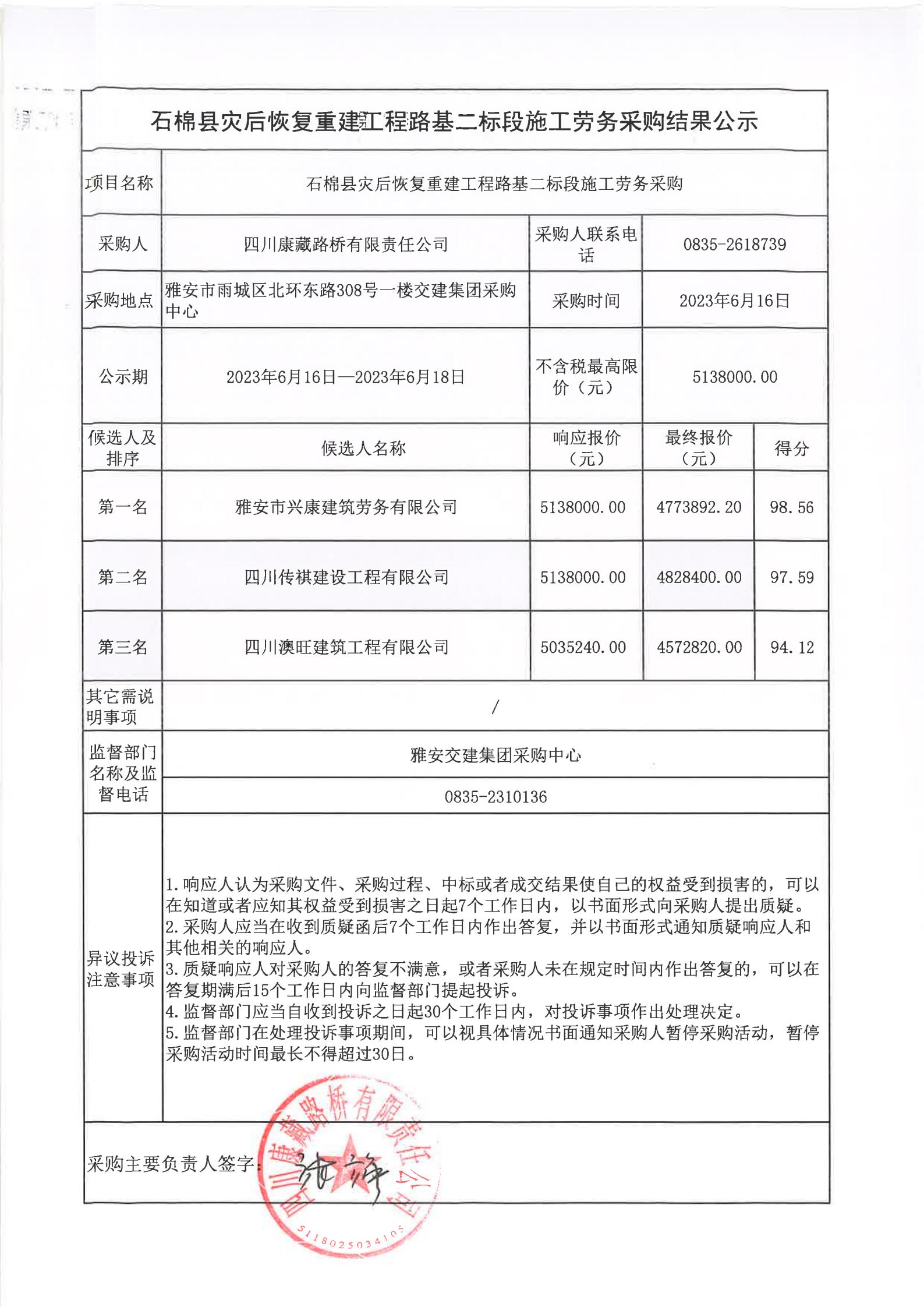 四川康藏路橋有限責(zé)任公司石棉縣災(zāi)后恢復(fù)重建工程路基二標(biāo)段施工勞務(wù)采購(gòu)結(jié)果公示