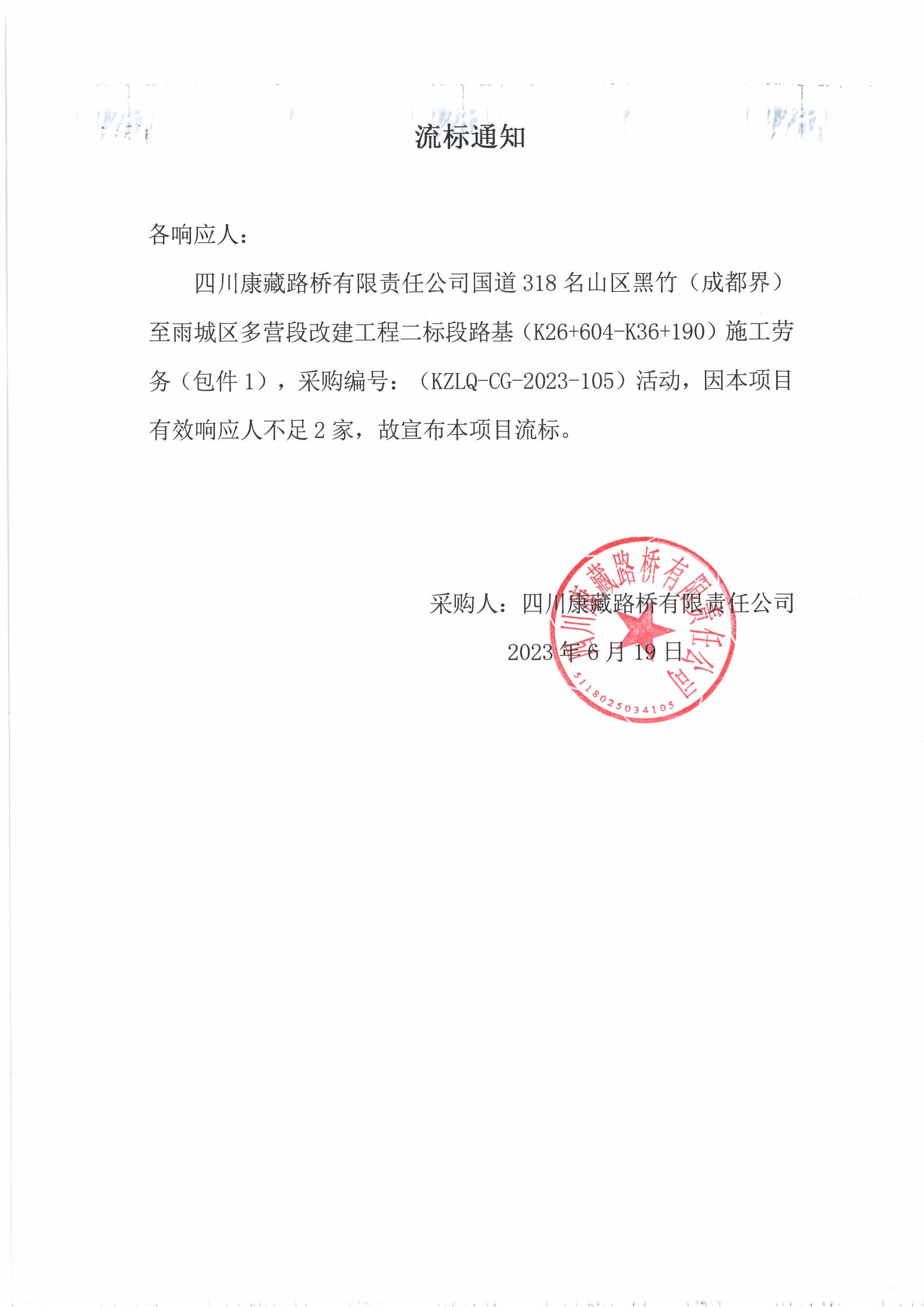 四川康藏路橋有限責(zé)任公司國(guó)道318名山區(qū)黑竹(成都界)至雨城區(qū)多營(yíng)段改建工程二標(biāo)段路基(K26+604-K36+190)施工勞務(wù)采購(gòu)(包件1)流標(biāo)通知