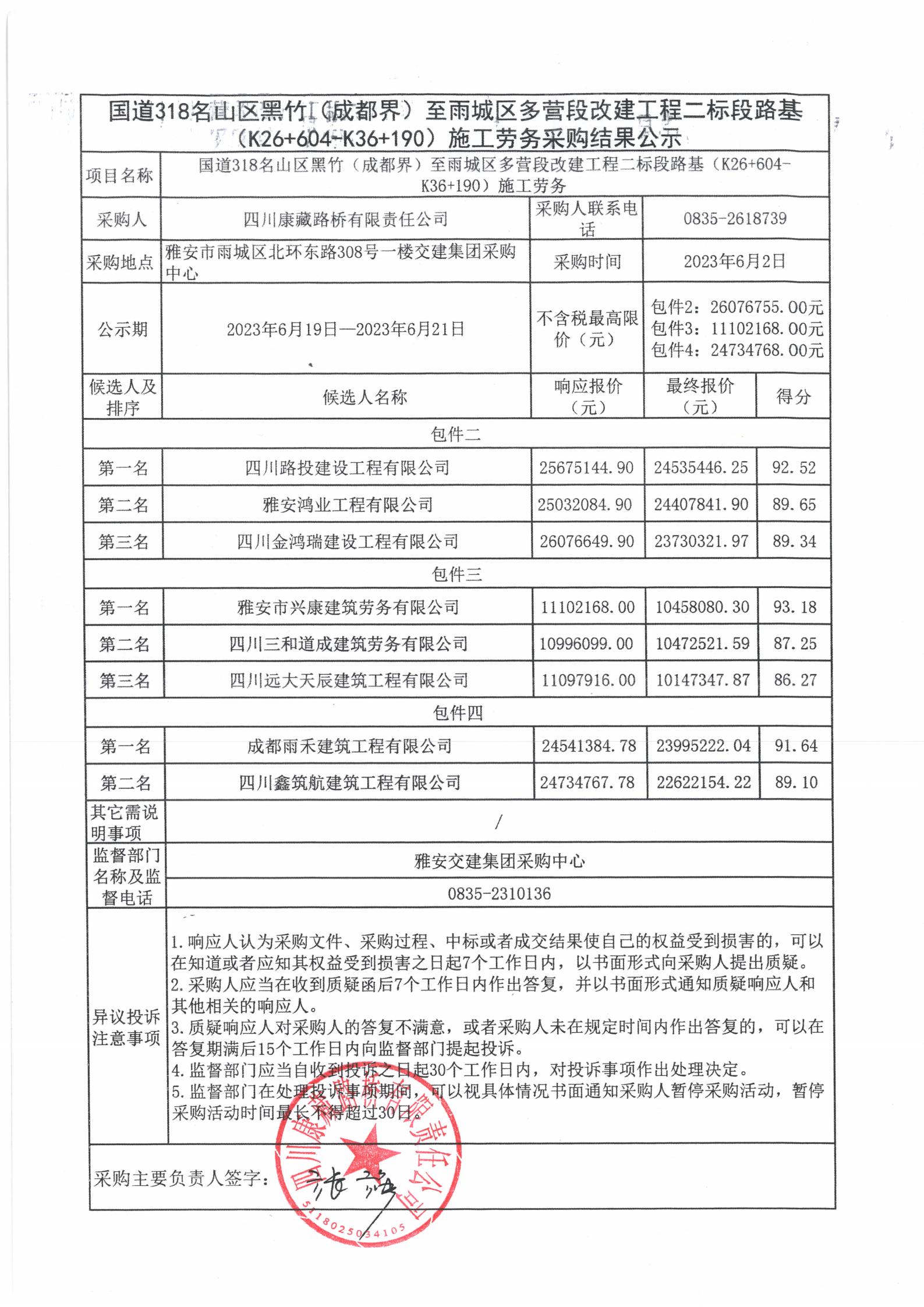 四川康藏路橋有限責(zé)任公司國道318名山區(qū)黑竹(成都界)至雨城區(qū)多營段改建工程二標(biāo)段路基(K26+604-K36+190)施工勞務(wù)采購(包件二、包件三、包件四)結(jié)果公示