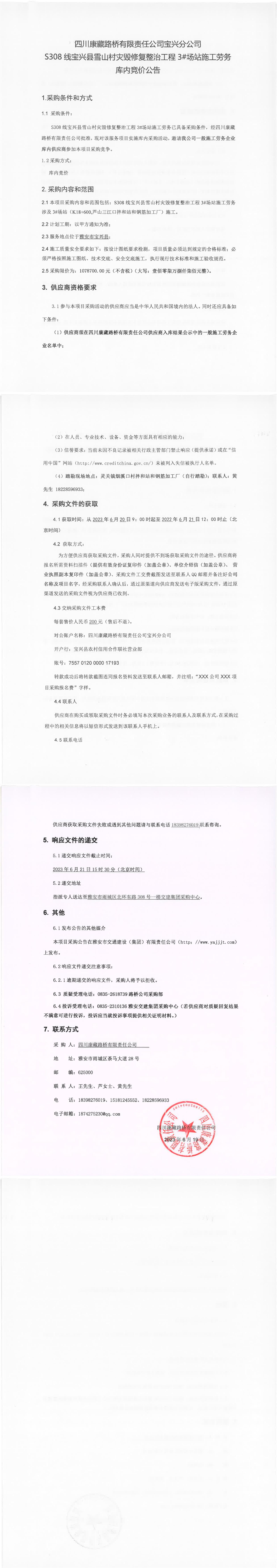 四川康藏路橋有限責(zé)任公司寶興分公司S308線寶興縣雪山村災(zāi)毀整治工程3#場(chǎng)站施工勞務(wù)庫內(nèi)競(jìng)價(jià)公告