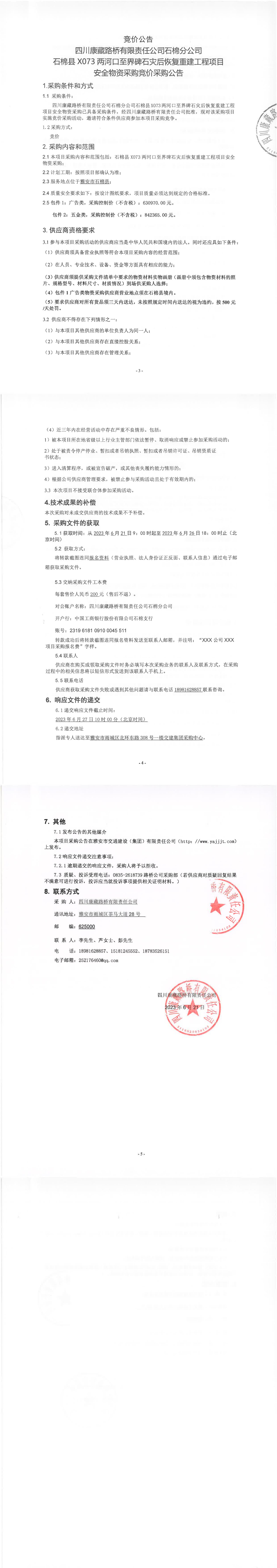 四川康藏路橋有限責(zé)任公司石棉分公司石棉縣X073兩河口至界碑石災(zāi)后恢復(fù)重建工程項(xiàng)目安全物資采購(gòu)競(jìng)價(jià)公告