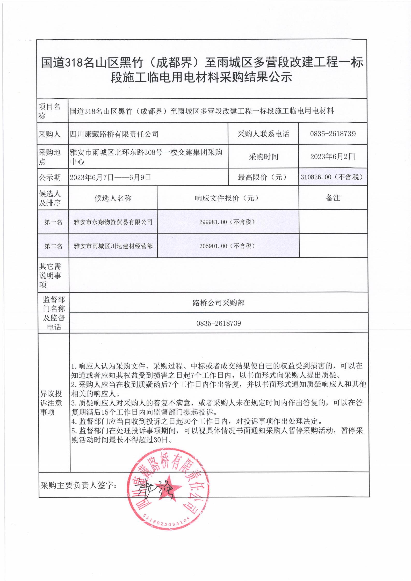 四川康藏路橋有限責(zé)任公司國(guó)道318名山區(qū)黑竹(成都界)至雨城區(qū)多營(yíng)段改建工程一標(biāo)段施工臨電用電材料采購結(jié)果公示