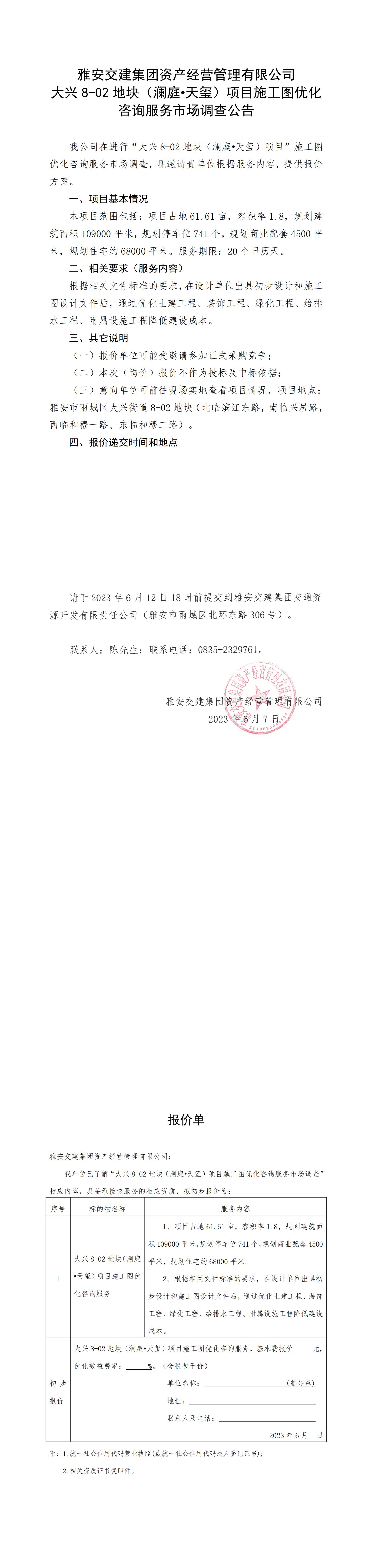 雅安交建集團(tuán)資產(chǎn)經(jīng)營管理有限公司大興8-02地塊(瀾庭·天璽)項(xiàng)目施工圖優(yōu)化咨詢服務(wù)市場(chǎng)調(diào)查公告