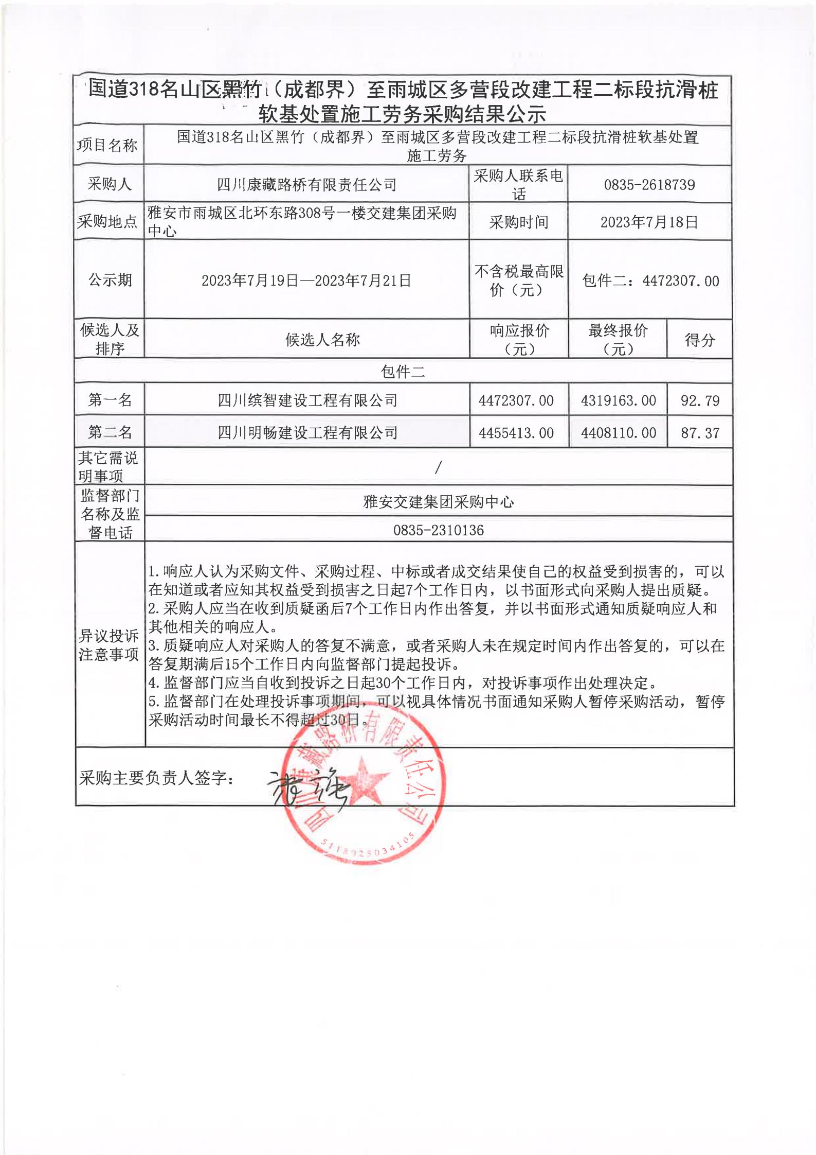 四川康藏路橋有限責任公司國道318名山區(qū)黑竹(成都界)至雨城區(qū)多營段改建工程二標段抗滑樁軟基處置施工勞務采購結(jié)果公示