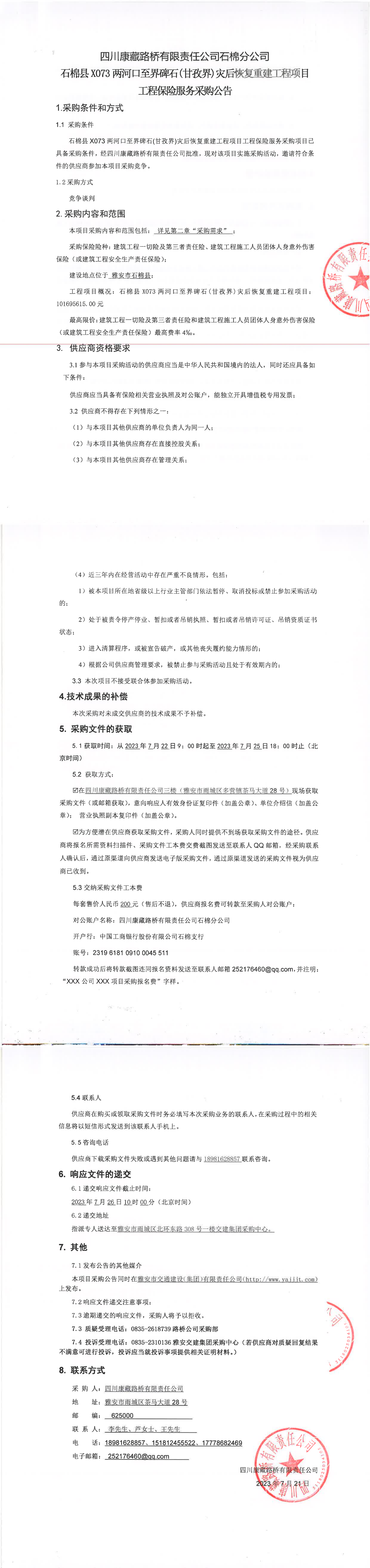 四川康藏路橋有限責任公司石棉縣X073兩河口至界碑石(甘孜界)災(zāi)后恢復重建工程項目工程保險服務(wù)采購公告
