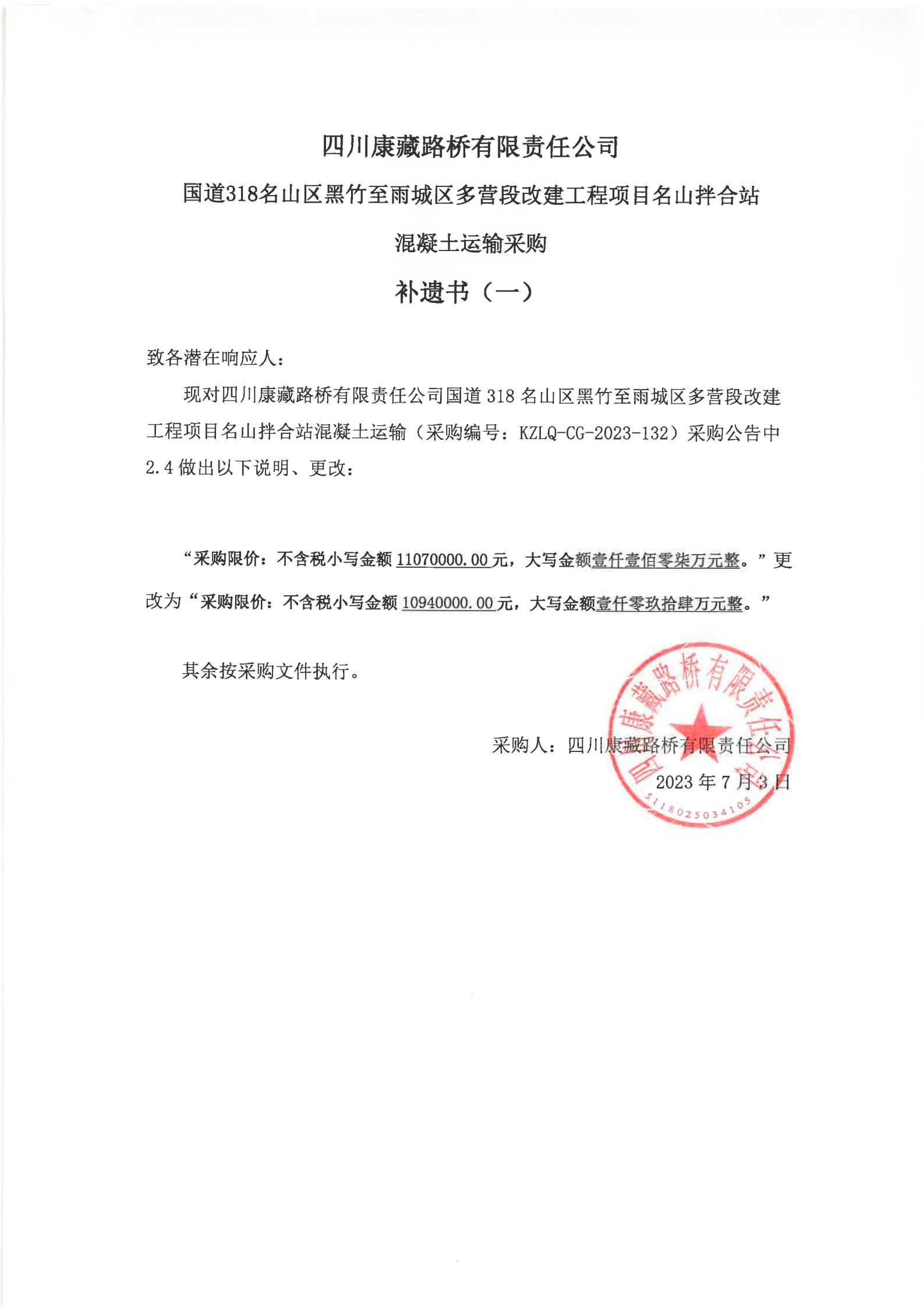 四川康藏路橋有限責(zé)任公司國道318名山區(qū)黑竹至雨城區(qū)多營段改建工程項(xiàng)目名山拌合站混凝土運(yùn)輸服務(wù)采購補(bǔ)遺書