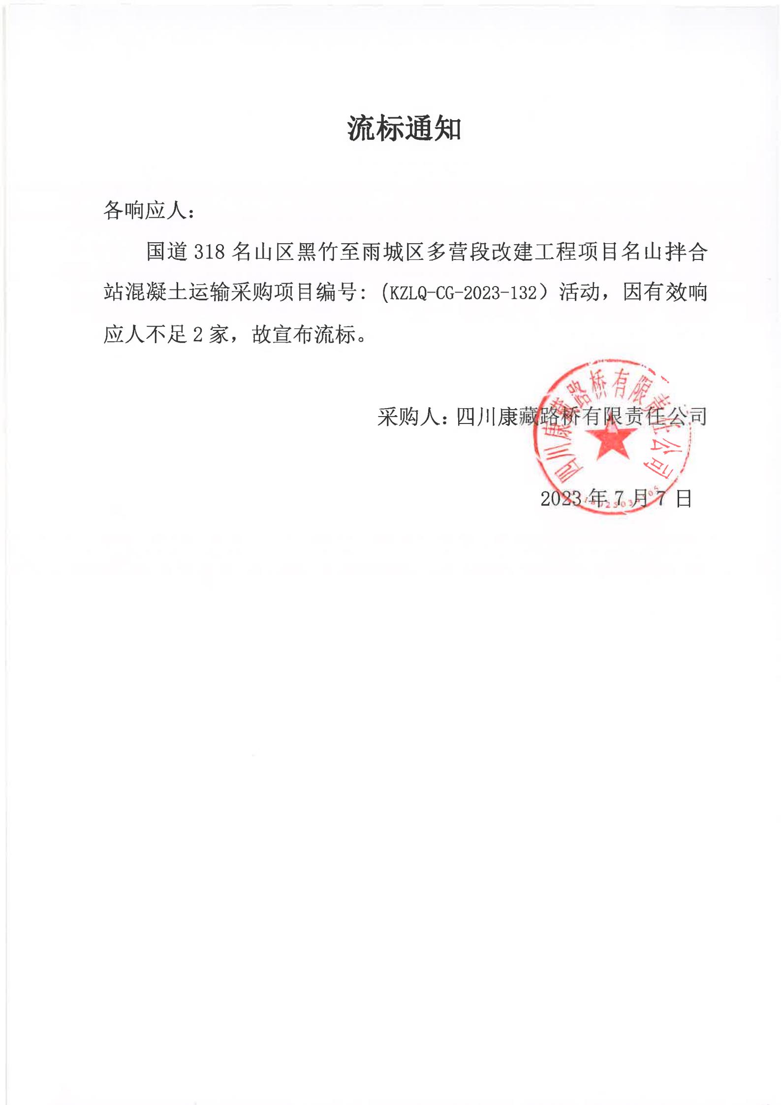 四川康藏路橋有限責(zé)任公司國道318名山區(qū)黑竹(成都界)至雨城區(qū)多營段改建工程項(xiàng)目名山拌合站混凝土運(yùn)輸采購流標(biāo)通知