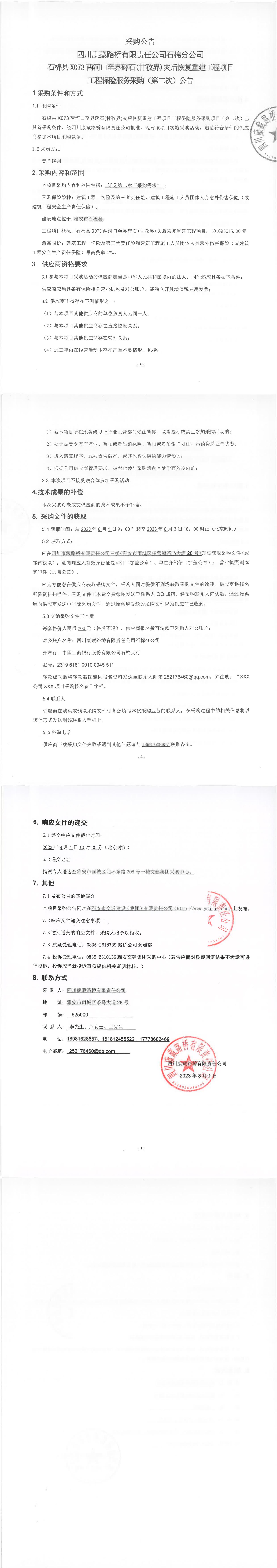 四川康藏路橋有限責(zé)任公司石棉分公司石棉縣X073兩河口至界碑石(甘孜界)災(zāi)后恢復(fù)重建工程項目工程保險服務(wù)采購(第二次)公告