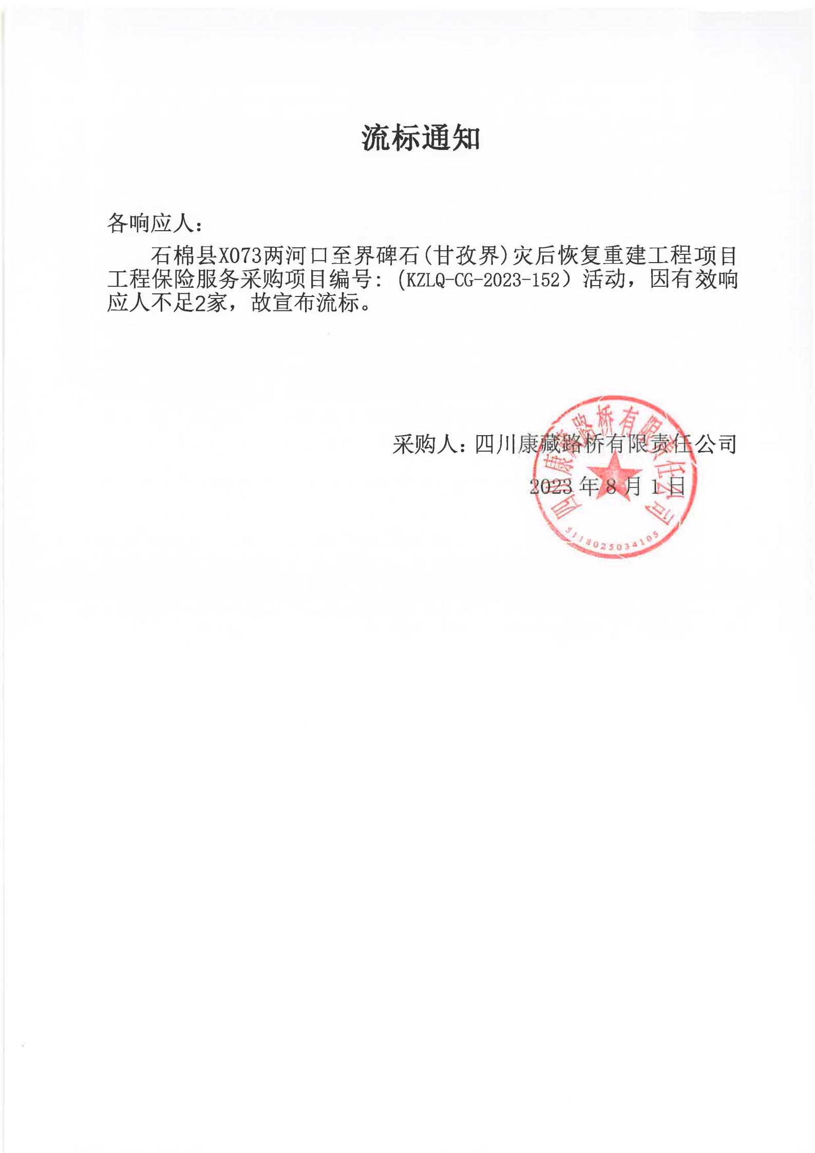四川康藏路橋有限責(zé)任公司石棉分公司石棉縣X073兩河口至界碑石(甘孜界)災(zāi)后恢復(fù)重建工程項目工程保險服務(wù)采購項目流標通知