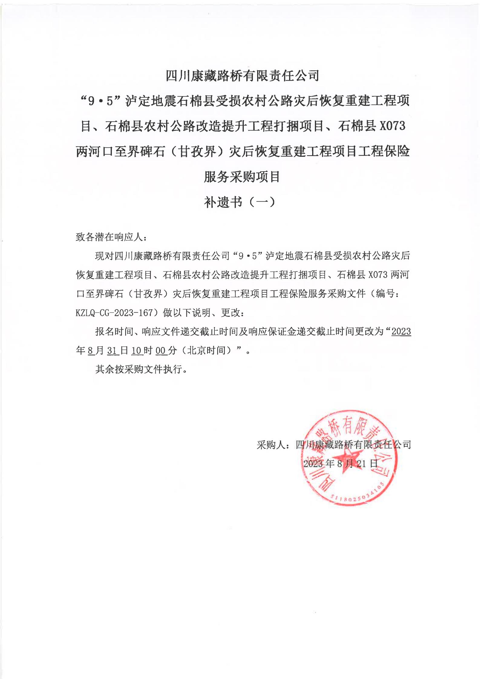 四川康藏路橋有限責(zé)任公司“9·5”瀘定地震石棉縣受損農(nóng)村公路災(zāi)后恢復(fù)重建工程項(xiàng)目、石棉縣農(nóng)村公路改造提升工程打捆項(xiàng)目、石棉縣X073兩河口至界碑石(甘孜界)災(zāi)后恢復(fù)重建工程項(xiàng)目工程保險(xiǎn)服務(wù)采購項(xiàng)目補(bǔ)遺書(一)