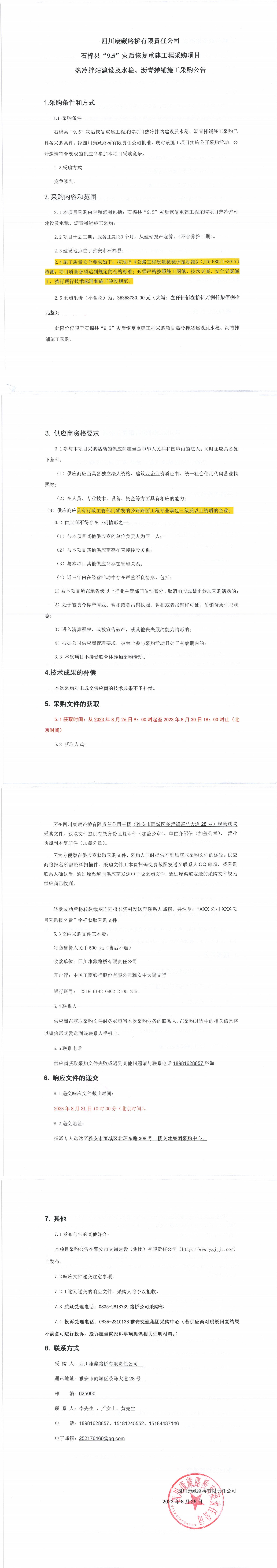 四川康藏路橋有限責任公司石棉縣“9.5”災后恢復重建工程采購項目熱冷拌站建設(shè)及水穩(wěn)、瀝青攤鋪施工采購公告