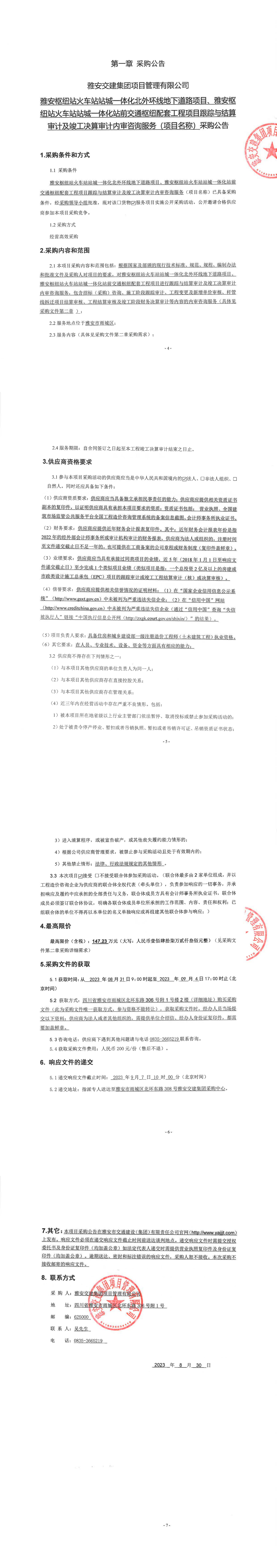 雅安交建集團(tuán)項(xiàng)目管理有限公司雅安樞紐站火車站站城一體化北外環(huán)線地下道路項(xiàng)目、樞紐站火車站站成一體化站前交通樞紐配套工程項(xiàng)目跟蹤與結(jié)算審計(jì)及竣工決算審計(jì)內(nèi)審咨詢服務(wù)(項(xiàng)目名稱)采購公告