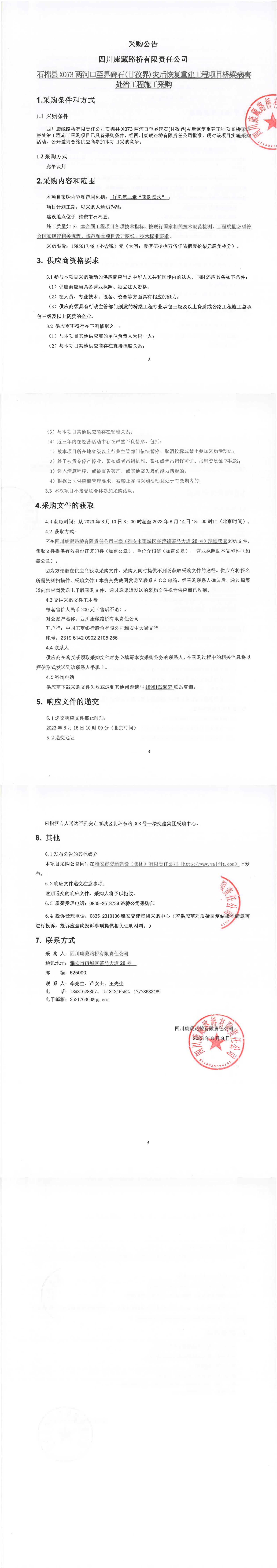 四川康藏路橋有限責(zé)任公司石棉縣X073兩河口至界碑石(甘孜界)災(zāi)后恢復(fù)重建工程項目橋梁病害處治工程施工采購