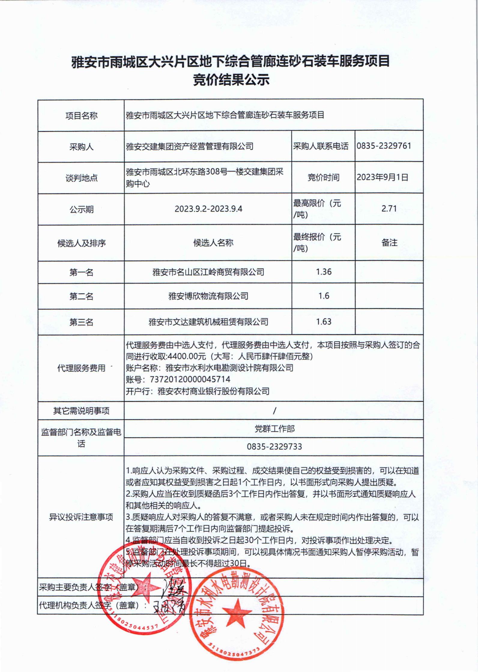 雅安交建集團(tuán)資產(chǎn)經(jīng)營管理有限公司大興片區(qū)地下綜合管廊連砂石裝車服務(wù)項(xiàng)目競價(jià)結(jié)果公示
