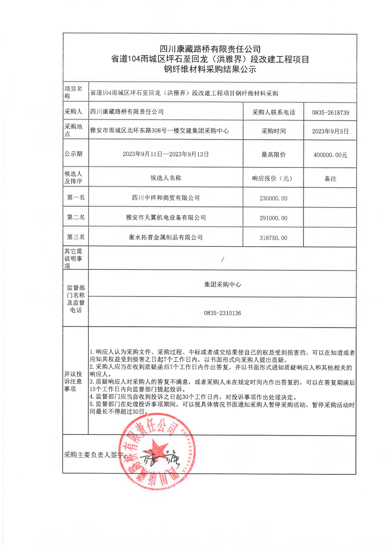 四川康藏路橋有限責(zé)任公司省道104雨城區(qū)坪石至回龍(洪雅界)段改建工程項目鋼纖維材料采購結(jié)果公示