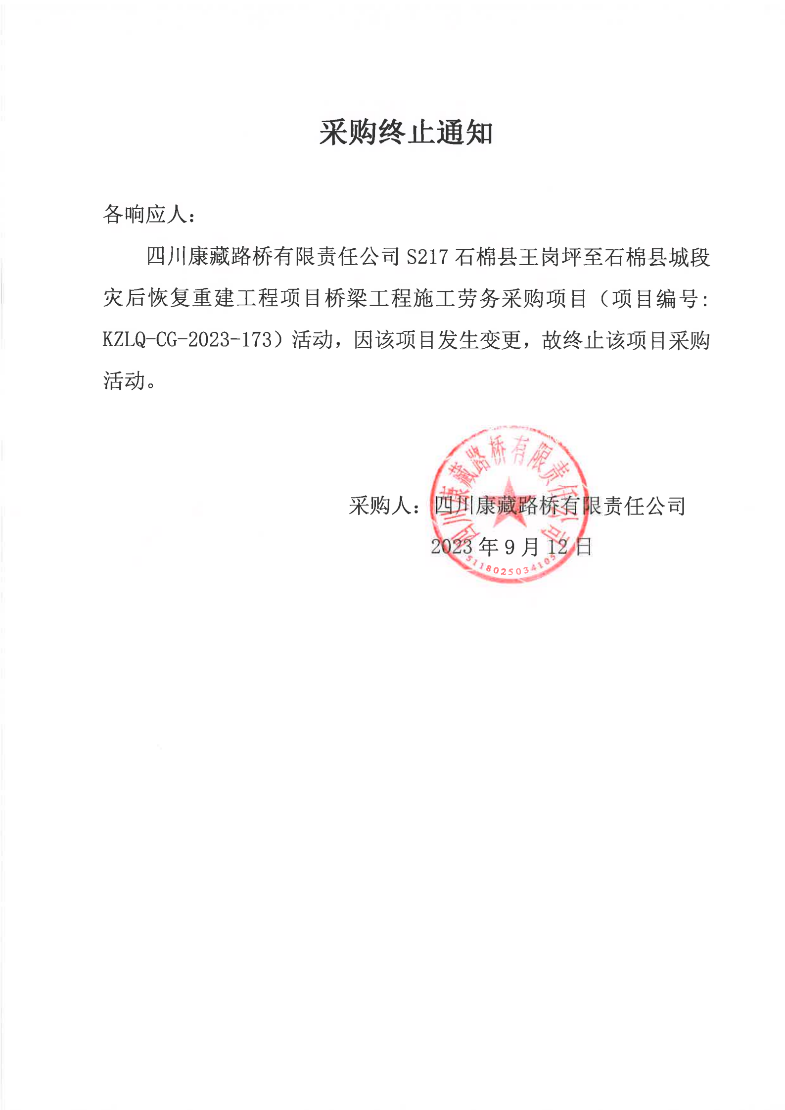 四川康藏路橋有限責任公司S217石棉縣王崗坪至石棉縣城段災后恢復重建工程項目橋梁工程施工勞務項目采購終止通知