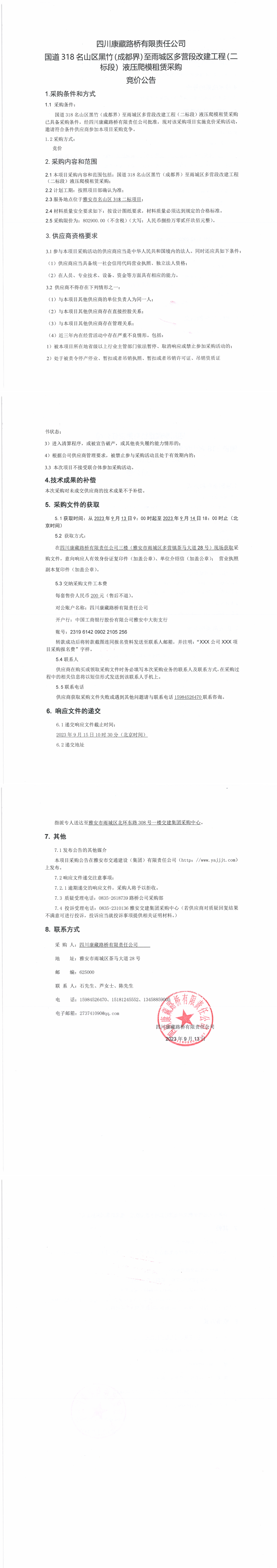 四川康藏路橋有限責(zé)任公司國(guó)道318名山區(qū)黑竹(成都界)至雨城區(qū)多營(yíng)段改建工程(二標(biāo)段)液壓爬模租賃采購(gòu)競(jìng)價(jià)公告