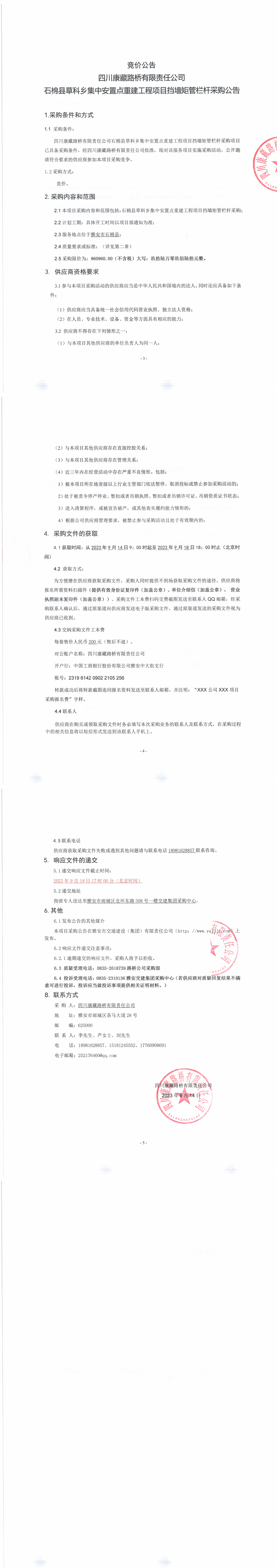 四川康藏路橋有限責(zé)任公司石棉縣草科鄉(xiāng)集中安置點(diǎn)重建工程項(xiàng)目擋墻矩管欄桿采購公告