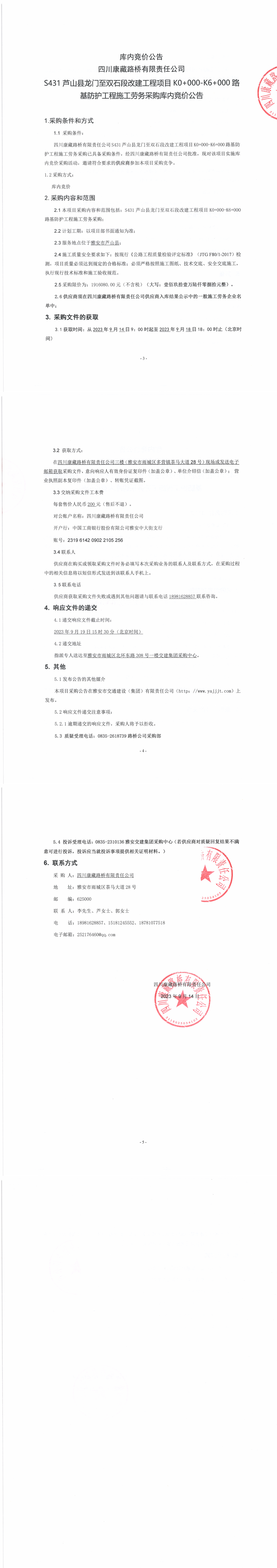 四川康藏路橋有限責任公司S431蘆山縣龍門至雙石段改建工程項目K0+000-K6+000路基防護工程施工勞務采購公告