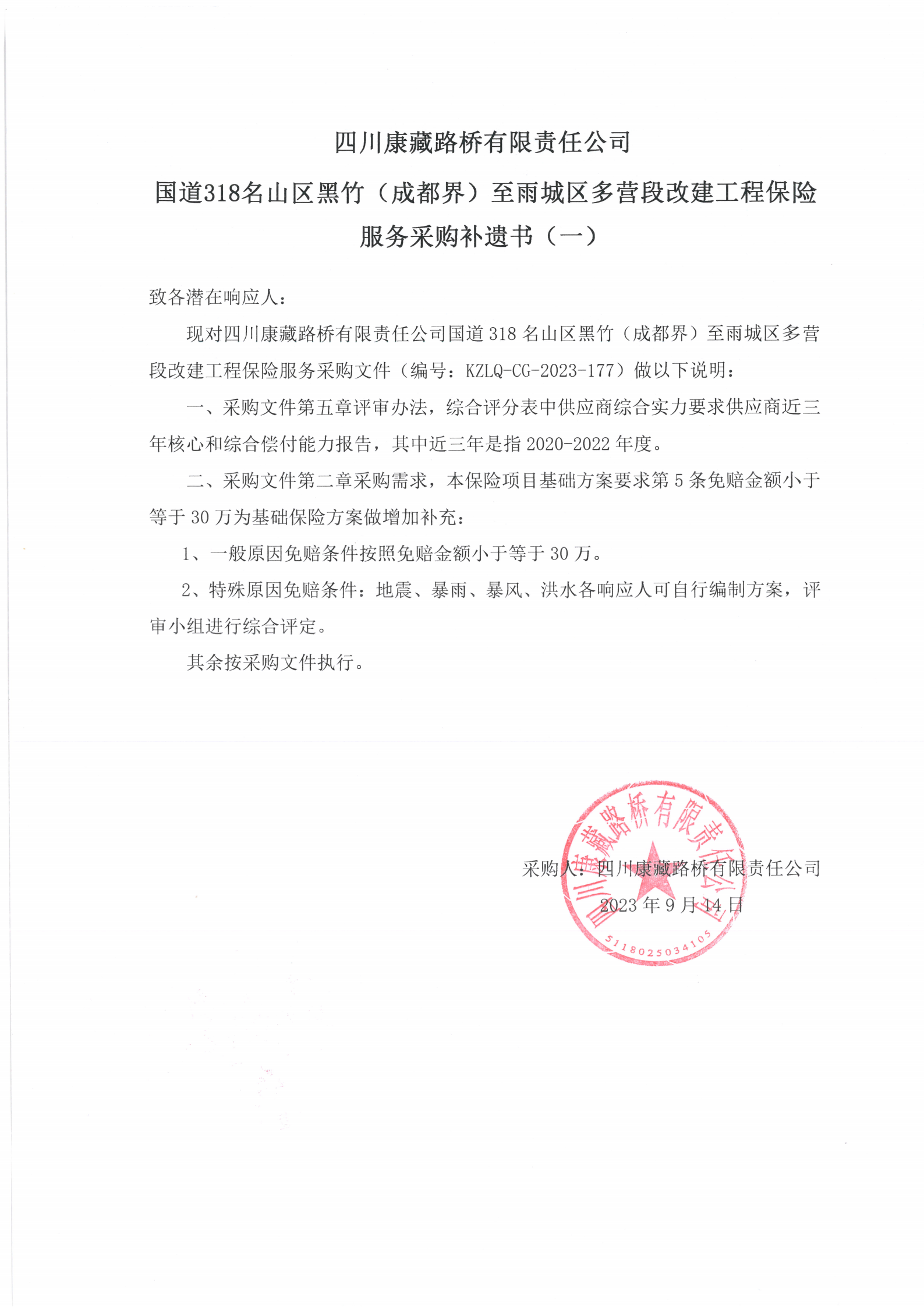 四川康藏路橋有限責(zé)任公司國道318名山區(qū)黑竹(成都界)至雨城區(qū)多營段改建工程保險服務(wù)采購補遺書(一)
