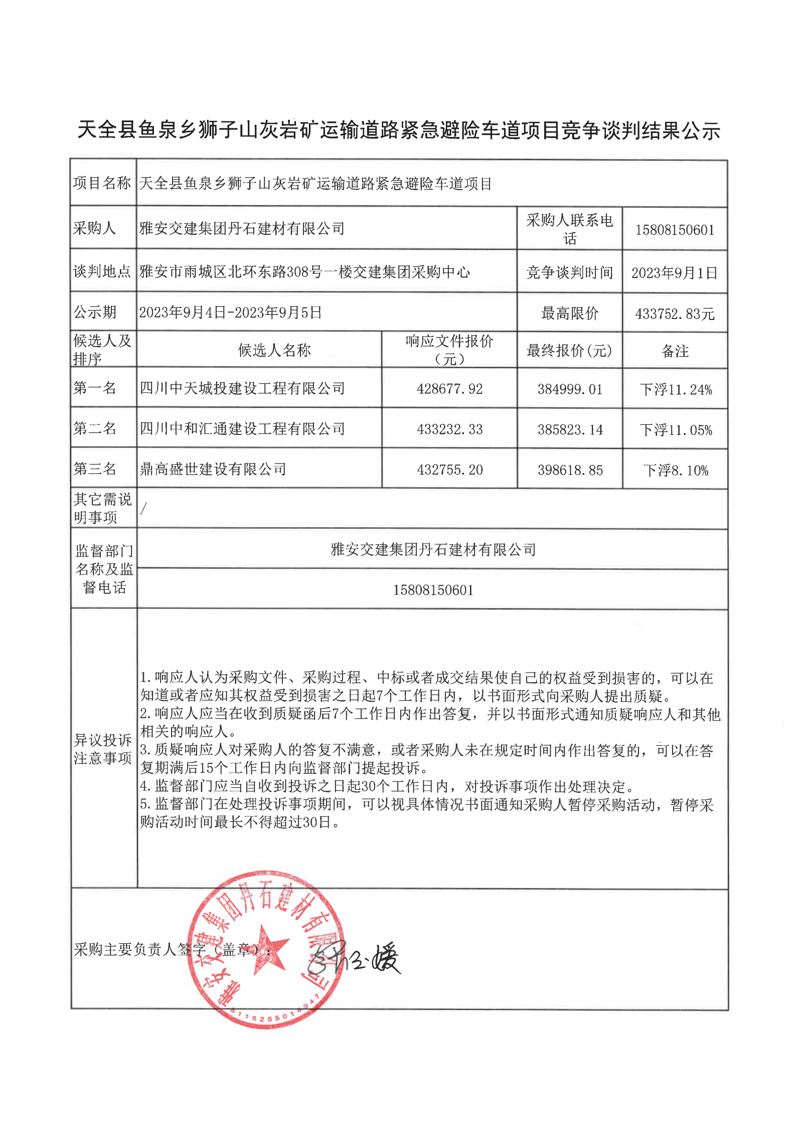 雅安交建集團(tuán)丹石建材有限公司天全縣魚泉鄉(xiāng)獅子山灰?guī)r礦運(yùn)輸?shù)缆肪o急避險(xiǎn)車道項(xiàng)目競(jìng)爭(zhēng)談判結(jié)果公示