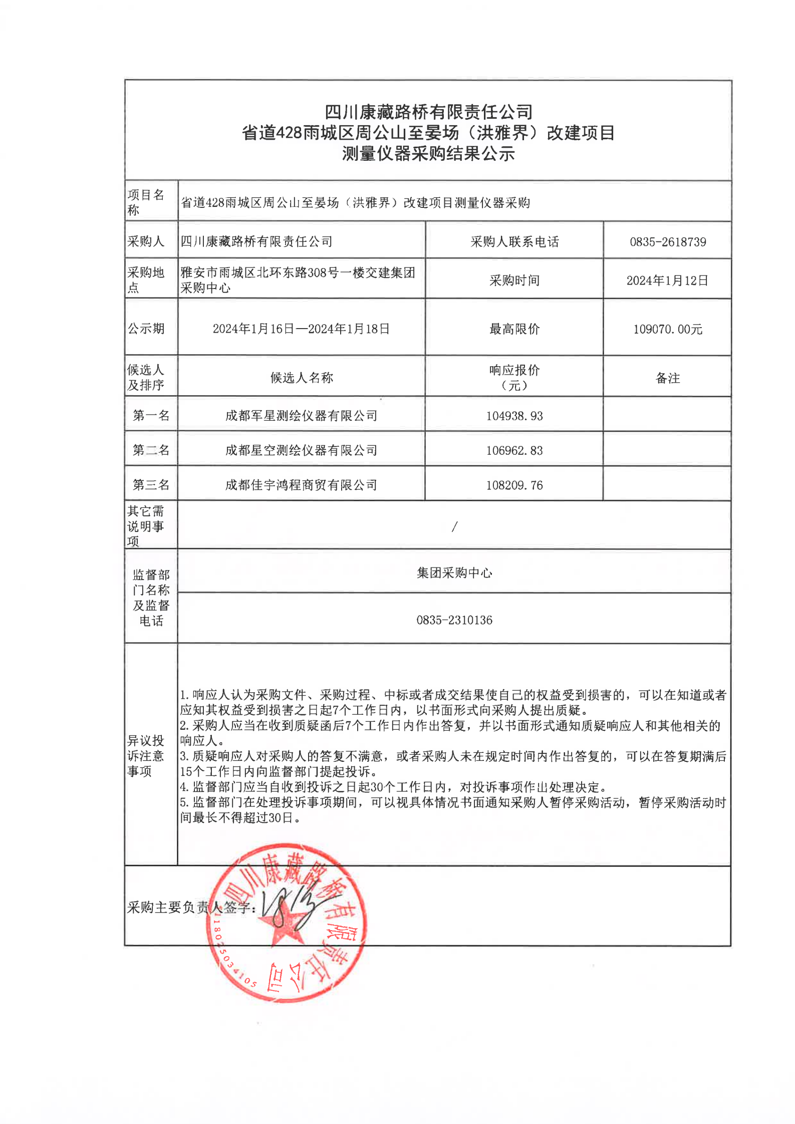 四川康藏路橋有限責(zé)任公省道428雨城區(qū)周公山至晏場(洪雅界)改建項(xiàng)目測量儀器采購結(jié)果公示