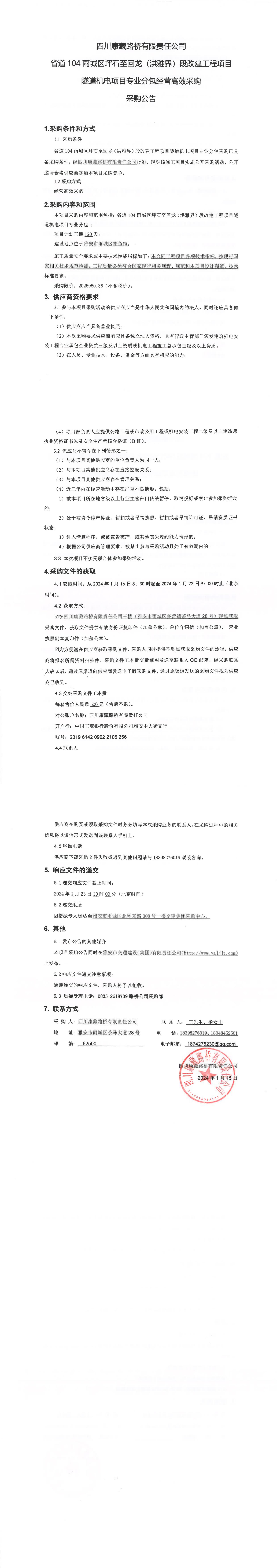 四川康藏路橋有限責(zé)任公司省道104雨城區(qū)坪石至回龍(洪雅界)段改建工程項目隧道機電項目專業(yè)分包經(jīng)營高效采購公告
