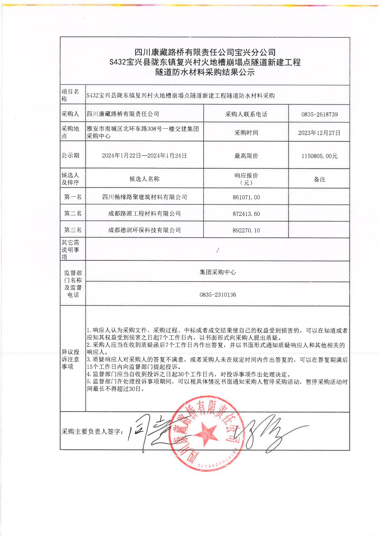 四川康藏路橋有限責(zé)任公司寶興分公司S432寶興縣隴東鎮(zhèn)復(fù)興村火地槽崩塌點(diǎn)隧道新建工程隧道防水材料采購結(jié)果公示