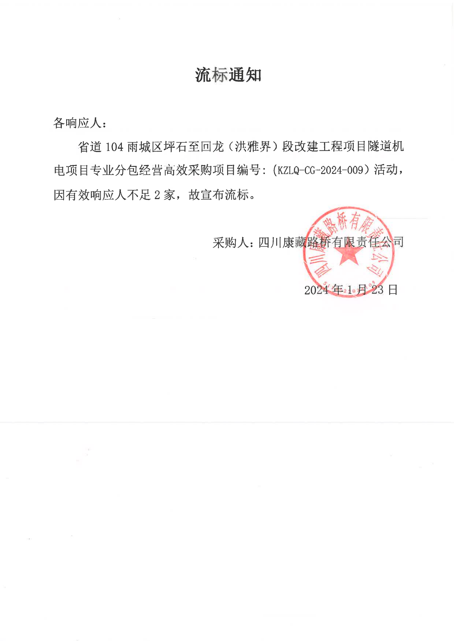 四川康藏路橋有限責(zé)任公司省道104雨城區(qū)坪石至回龍(洪雅界)段改建工程項目隧道機(jī)電項目專業(yè)分包經(jīng)營高效采購流標(biāo)通知