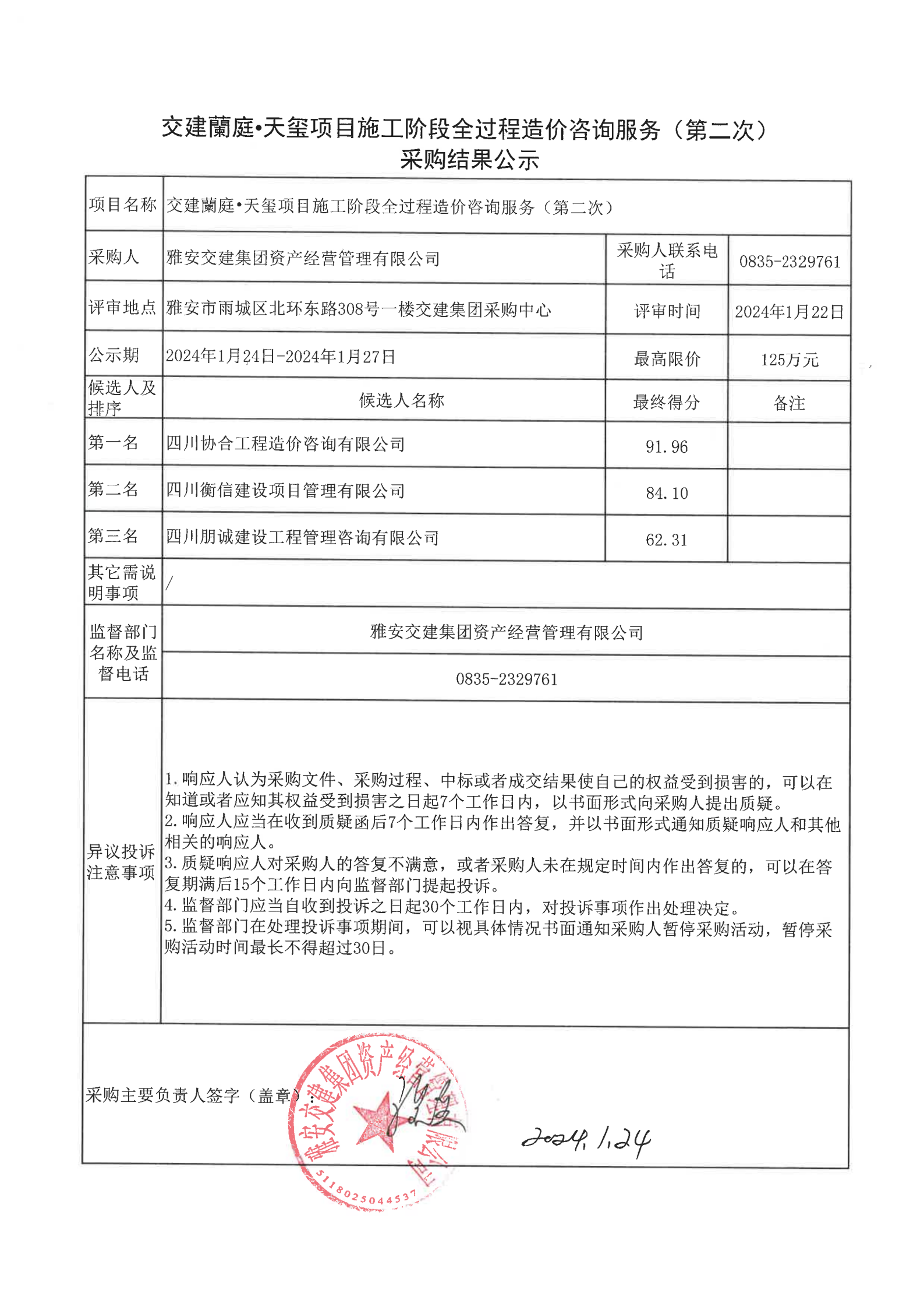 雅安交建集團(tuán)資產(chǎn)經(jīng)營(yíng)管理有限公司交建蘭庭·天璽項(xiàng)目施工階段全過(guò)程造價(jià)咨詢(xún)服務(wù)(第二次)采購(gòu)結(jié)果公示